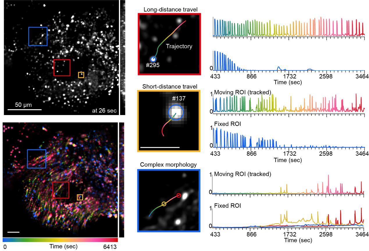 Figure 5. Tracking performance under Drosophila brain tissue deformation. Upper left: raw image; lower left: temporal-color coded projection image; right: representative traces of transient calcium activity of neurons with and without tracking.