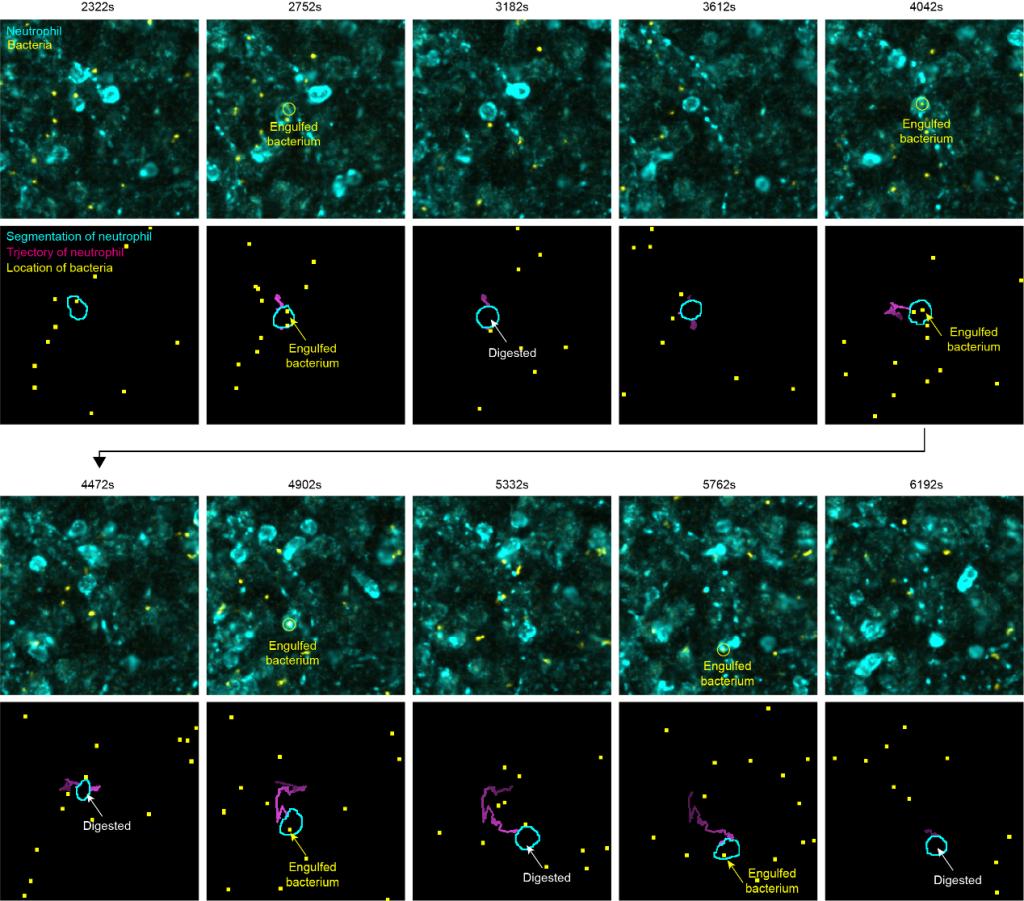Figure 4. Representative result of automated segmentation and tracking of a neutrophil engulfing bacteria.